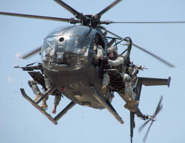 AH-6は外装型座席を装着することにより最大6名の完全武装した兵士を輸送することが可能(画像:アメリカ陸軍)。
