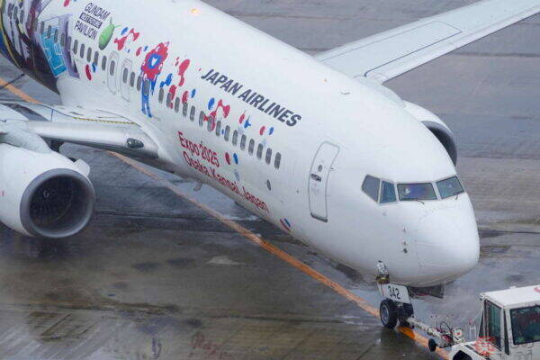 担当機はボーイング737-800「JA342J」で、機体には、同万博内でバンダイナムコが出展する「GUNDAM NEXT FUTURE PAVILION」内の映像に登場する「RX-78F00/E ガンダム(EX-001 グラスフェザー装備)」のイメージに加えて、大阪・関西万博公式キャラクター「ミャクミャク」も描かれます。使用されたデカールは100枚近くにも及び、全長約25mのサイズ。デザインも左右で異なります。