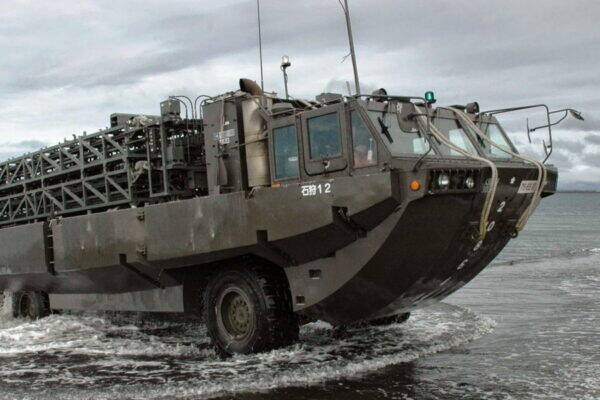 訓練で砂浜から上陸する94式水際地雷敷設装置。単独で陸上と水上を行き来できるため、輸送車両としてのニーズもあるかもしれない(画像:陸上自衛隊)。