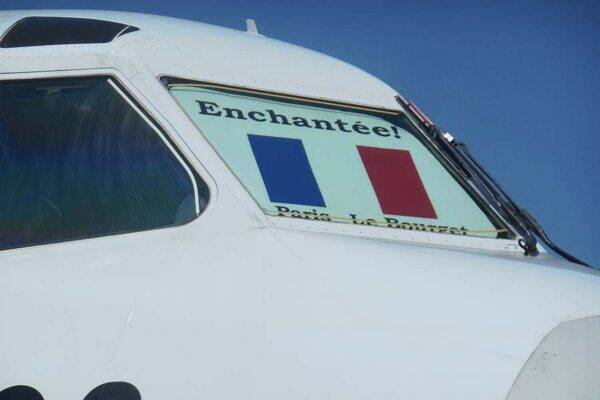 2017年パリエアショーに参加したP-1哨戒機の窓にはフランス語で「はじめまして」と書かれたメッセージボードが貼られていた(竹内 修撮影)
