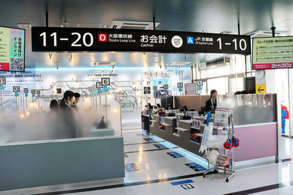 会場オフィシャルストアは「未来の鉄道駅舎」をイメージした作りになっており、天井の半球体ディスプレイを用いた映像演出のほか、JR西日本の乗り口をイメージしたレジなどが目を引きます。