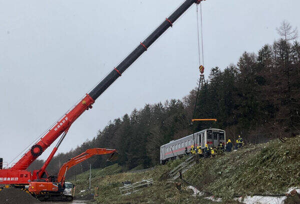 クレーンで吊り上げられる脱線列車(画像:JR北海道)。