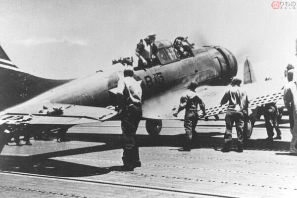 空母「ヨークタウン」に着艦したSBD-3「ドーントレス」急降下爆撃機。尾翼が破損している(画像:アメリカ海軍)