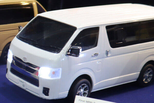 京商ブースで異彩を放つクルマ静岡市のツインメッセ静岡で2024年5月14日から18日まで行われている「第63回静岡ホビーショー」の京商ブースで小型RC(ラジオコントロール:ラジコン)ブランドである「ファーストミニッツ」シリーズでトヨタ「ハイエース」のカラーバリエーションが公開されました。
