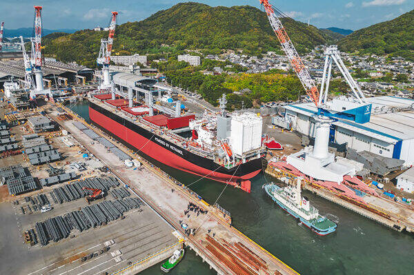 常石造船常石工場では5月13日に世界初のメタノールDFウルトラマックスバルカー「Green Future」(約6万5700重量トン)が竣工。同工場では水素燃料タグボートの建造も進められています。