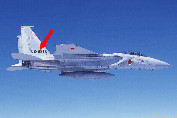 航空自衛隊のF-15。矢印の部分がなぞのナンバー(画像:航空自衛隊の画像を加工)