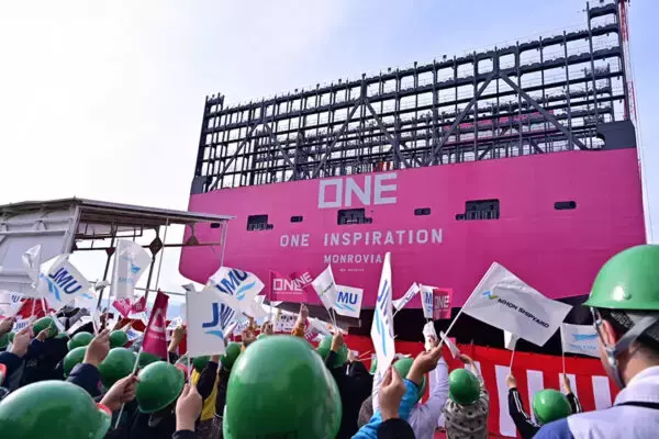 JMU呉事業所で竣工した世界最大級のコンテナ船「ONE INSPIRATION」(深水千翔撮影)