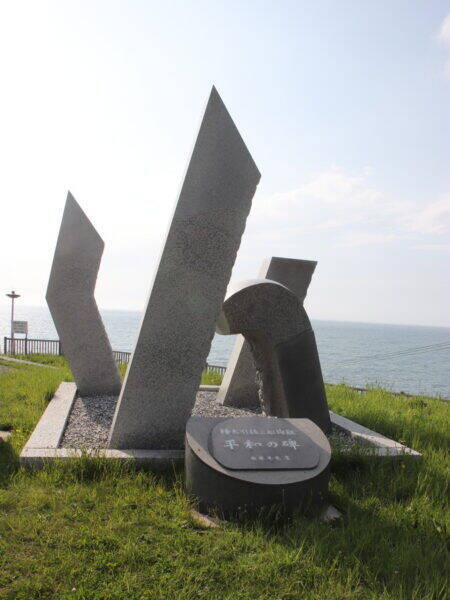 留萌市の海のふるさと館横公園に建てられている「樺太引揚三船殉難(からふとひきあげさんせんじゅんなん)平和の碑」(柘植優介撮影)。