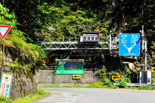 国道158号「奈川渡(ながわど)改良」事業の一環として、新入山トンネルの工事が進行中。2025年9月からは、夜間の交通規制が始まりました。