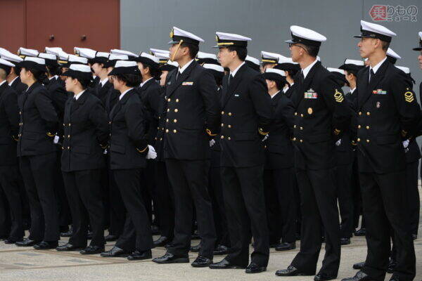 さて、この日の横須賀は晴れていたものの、海風がえげつないレベルで冷たい……。しかし取材しているこちらが震えているなか、来賓を待つため整列している自衛官は一歩も動かず背筋を伸ばしていてさすがです。とはいえ、あとで海上自衛官である夫のやこさんに聞いたら「寒い日の行事はヒートテック2枚重ね」とのこと。