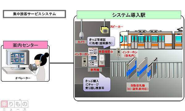 「集中旅客サービスシステム」の概要。駅にはインターホンや券面確認台、カメラ、スピーカーなどが設けられる(画像出典:JR東海)。オペレーターがカメラを通じて駅の状況を把握するとともに、利用者の問い合わせ対応や案内放送なども実施。現地対応が必要なときは、係員が現地に出向きます。