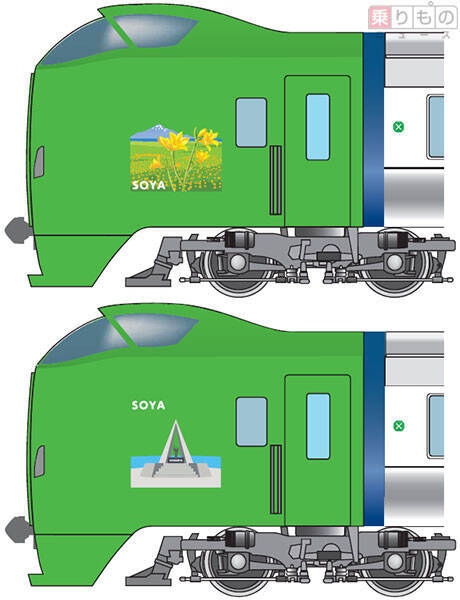 編成テーマが「宗谷」の車両ラッピングイメージ。サロベツ原野(上)や宗谷岬(下)などがデザインされる(画像出典:JR北海道)。ラッピングのデザインは編成ごとに異なります。運転区間や、旭川駅で接続する列車の沿線である稚内、網走方面にちなみ、宗谷、オホーツク、上川、空知、旭川、札幌といったテーマを設定。たとえば宗谷がテーマの編成には、レブンアツモリソウ(礼文島のみに分布するラン)や利尻山、サロベツ原野、宗谷岬が、札幌の編成には円山動物園(札幌市中央区)にいる動物や時計台、クラーク像が車体にそれぞれデザインされます。
