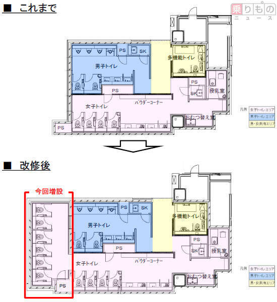高速バスの出発階である4階の女子トイレは、2か所あるうちの代々木側の個室が今回、4室から10室に増やされたほか、甲州街道側も2017年春ごろに個室が4室から11室に増やされる計画です。パウダーコーナーや洗面台もそれぞれ増設されるほか、着替え室が2室新設されます。この甲州街道側は男子トイレも個室が2室増やされる予定です。