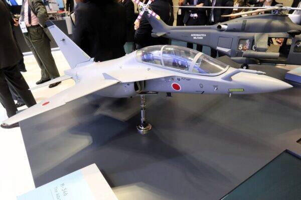 2023年に開催されたDSEI Japanにおいて、レオナルド社が展示したM-346の模型(乗りものニュース編集部撮影)。