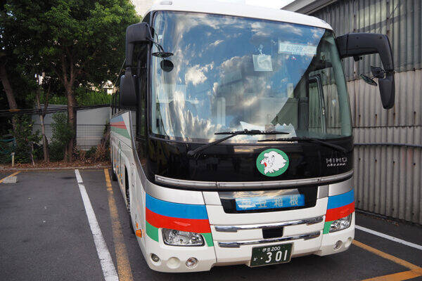 東急ホテル地下1階の出入り口に横付けされていたのは、伊豆箱根バス(静岡県三島市)の日野自動車の大型バス「セレガ ハイデッカ」でした。西武グループらしく白い車体に青と赤、緑のラインが入った「ライオンズカラー」ですが、乗降口の隣でほほえんでいたのはなんと、はとバスの制服を着たバスガイドさんです。