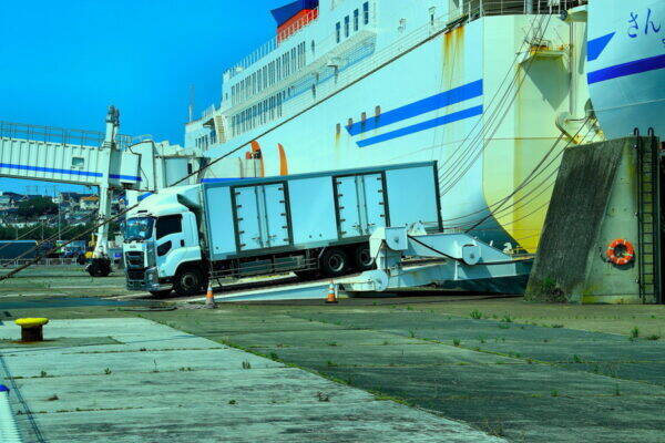 荷物をクレーンで1つずつ吊り上げて積み込む一般的なコンテナ船とは異なり、車両が自ら走って乗り降りできるため、積み下ろしの時間を短縮でき、荷役効率が高いのが特徴です。