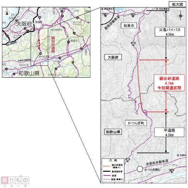 新たに開通する道路はどちらも2車線(片側1車線)です。北から順に「父鬼バイパス」「鍋谷峠道路」「平道路」が一体となってつながることで、国土交通省近畿地方整備局によると、和泉市役所からかつらぎ町役場までの所要時間は、現在の約71分から約53分に短縮されるといいます。