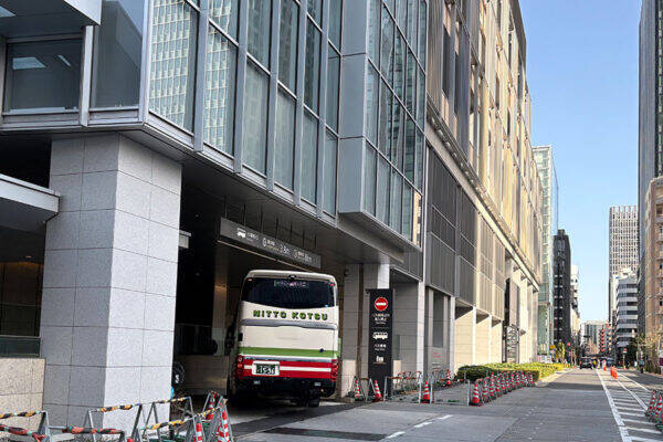 東京ミッドタウン八重洲の「地下B」に入る高速バス。あおぎり通りという細い路地に面する(乗りものニュース編集部撮影)