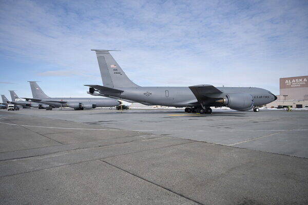 駐機する複数のKC-135。大型空中給油機はシェルターなどの収納することもできず、地上にある時は非常に脆弱な目標となる(画像:アメリカ空軍)