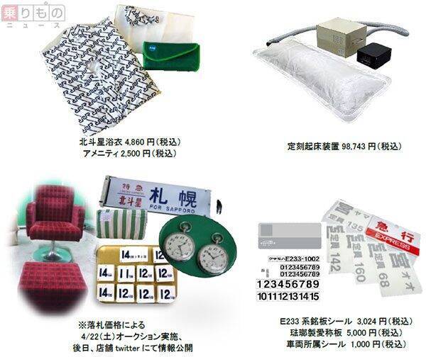 「General STORE RAILYARD」で取り扱われる商品の一例。古物はオークションが行われる(画像:JR東日本リテールネット)。駅員が目覚まし時計代わりに使用している「定刻起床装置」は9万8743円(税込。以下同じ)。寝台特急「北斗星」で使われていた浴衣やアメニティは復刻されたものが、それぞれ4860円、2500円で発売されます。