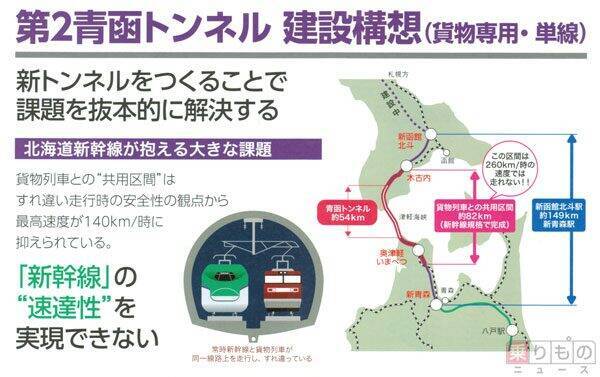 この第2青函トンネル構想について、「北海道新幹線の所要時間を18分短縮するためのコストとしては大きすぎる」「整備新幹線として造られたため最高速度が260km/hである東北新幹線・盛岡~新青森間の速度を上げれば所要時間を短縮できる」などの批判もあるようです。しかし、問題は北海道新幹線の時間短縮だけではありません。北海道新幹線、貨物列車、両方の増発をしにくい状況です。整備新幹線区間の速度向上と第2青函トンネルの整備は、どちらかを選択すればいいという話ではなく、両方とも実現すべきだと筆者は考えます。また、新幹線の高速化というよりも貨物列車の増強案として、第2青函トンネルは必要ではないでしょうか。