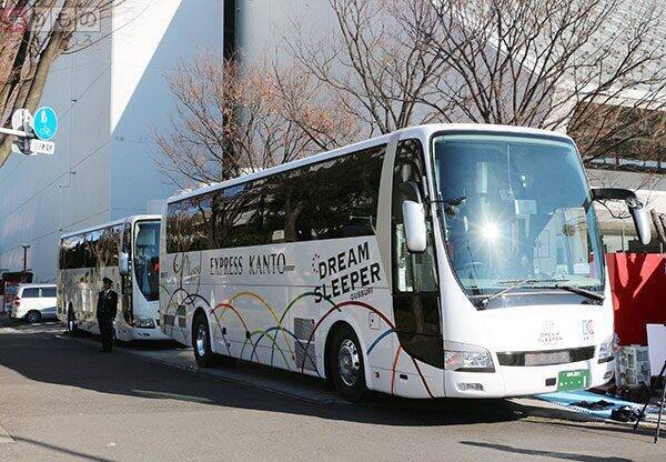 手前が関東バス保有の「ドリームスリーパー東京大阪号」車両(2017年1月、中島洋平撮影)。
