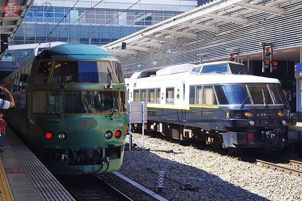 特急「ゆふいんの森」(左)と並ぶ特急「あそぼーい!」(児山 計撮影)。