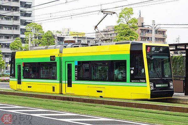 7500形は2017年3月にデビュー。1000形「ユートラム」、7000形「ユートラムII」に続いて導入された超低床の路面電車車両です。ふたつの車体をつなげた連接車で、外観は「交通局カラー」とする太陽をイメージしたイエローと、芝生軌道をイメージしたグリーンを配置。前面はブラックとし、印象を引き締めたものとしています。