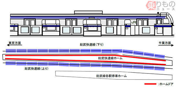 新小岩駅の総武快速線ホームにおけるホームドアの設置イメージ(画像:JR東日本)。