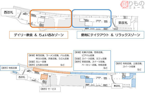 コンセプトは「ごちぶらナンバ」。ひとりでもぶらりと気軽に立ち寄って楽しめる「食」のエンターテイメントゾーンを創造するといいます。8月末ごろにカレー店「船場カリーplus」(移転・改装)、9月末ごろにスイーツ店「GOKOKU」(改装)、11月ごろに和菓子店、2019年2月ごろに寿司店、串カツ店、洋食店、うどん店、夏ごろに惣菜店、ラーメン店、バル店、ビアバル店、カフェ店「カフェチャオプレッソ」(移転・改装)がそれぞれオープンする予定です。