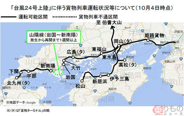 台風24号の影響で土砂流入が発生したため、旅客列車は山口県内の柳井~下松間で、貨物列車はこの区間を含む岩国~新南陽間で運転を見合わせています。JR西日本はバス代行輸送を、JR貨物はトラックによる代行輸送や貨物列車の迂回(うかい)運転をそれぞれ実施中です。