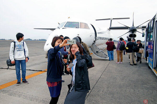 到着後はQ400との記念撮影。飛行機から降りた参加者は、Q400を思い思いに撮影。機長の鳥山恒正さんと八島義治さん、客室乗務員(CA)の米満利恵さんと吉村かおりさんもQ400から降りてきて、参加者との記念撮影に応じていました。