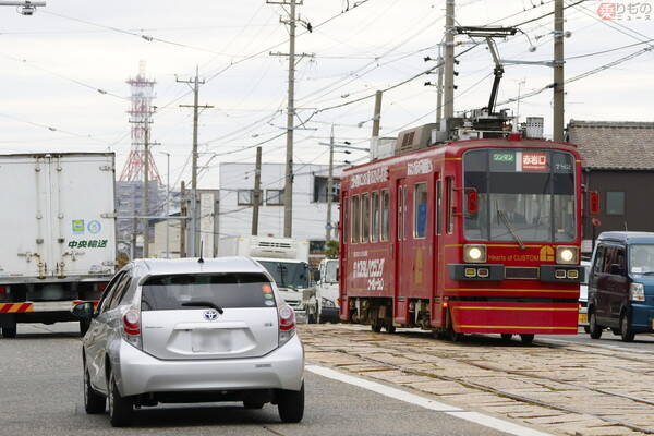 路面電車の軌道敷は、クルマの通行を考えレールの周囲がアスファルト舗装されていることも多いですが、豊橋鉄道には1か所だけ、それが石畳の区間が存在。「石畳を駆け上がる路面電車」という「鉄☆たびスポット」になっています。