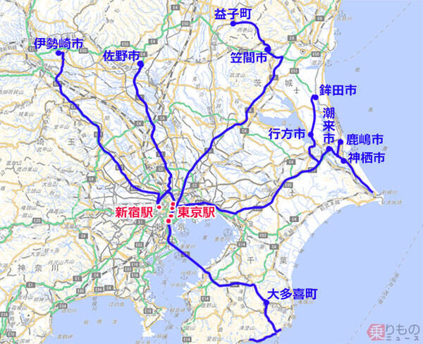関東には、鉄道よりも高速バスが「東京への足」として便利な地域があります。東京都心部への直通列車はあるものの、乗り換えが必要になることが多かったり、あるいは鉄道の駅から離れたりしている地域に、高速バスが路線網を形成しているのです。