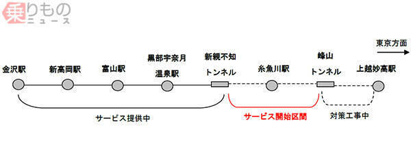 上越妙高駅から峰山トンネルまでの区間は、対策工事を継続。サービス開始時期は時期が決まり次第告知されます。