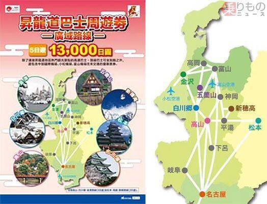 愛知、岐阜、金沢、富山にまたがる外国人向け「昇龍道フリーバスきっぷ」のチラシイメージ(画像:名古屋鉄道)。