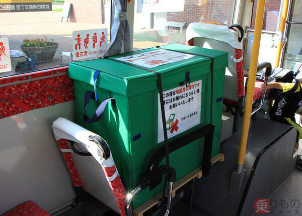 北紋バスの路線バスを活用した「貨客混載」の例(須田浩司撮影)。