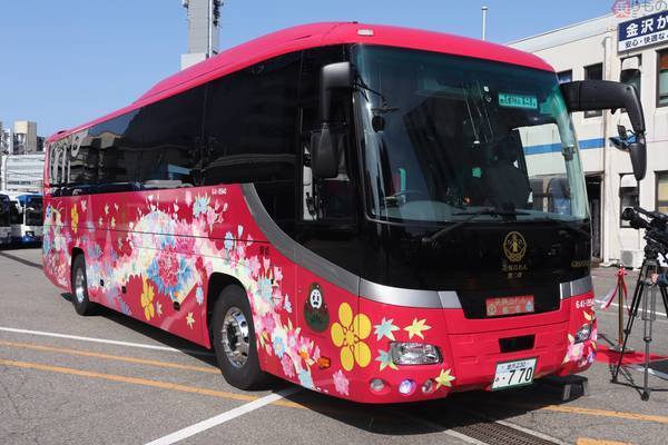 夜行高速バスで使われているハイグレードバス「グランドリーム」がベース。外装は加賀友禅の作家、毎田健治さんが描き下ろした絵で装飾され、「石川の華やかな四季」を表現したといいます。ナンバーは能登半島の石川県七尾(ななお)市にちなんだ「770」でした。
