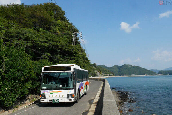 その後、3つの橋を渡って上蒲刈島、豊島、大崎下島を走行。各島内ではほぼ海沿いを走り、大崎下島内では「このままバスが海に入るのでは」と思うほど急な、岬の先端部にあるカーブを曲がっていきます。大崎下島を半周し、終点の「沖友天満宮」バス停で乗客を降ろしたバスは、もはや運転席から釣り糸が垂らせそうなほどの海沿いに停車し、折り返しの広島行きとなるまで休憩します。