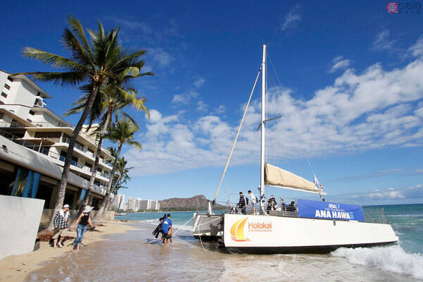 ANAがエアバスA380型機「フライングホヌ」をハワイ線へ就航させるのに合わせて、船の「セイリングホヌ」も登場。ANAのツアー参加者は無料で使え(条件あり)、アルコールも無料というその船へ、実際に乗ってみました。