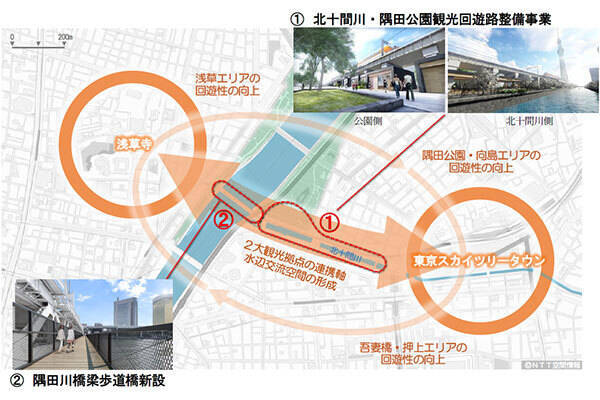 歩道橋は既存の鉄道橋下流側に添うように造ります。通路幅は2.5m、延長は約160mです。2020年の東京オリンピック・パラリンピック開催に向け、観光拠点である浅草(東京都台東区)と東京スカイツリータウン(同・墨田区)を結ぶ最短ルートとして整備し、回遊性向上を図ります。完成は2020年春の予定です。