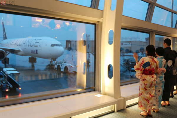 この日はあいにくの雨模様でしたが、搭乗口は七夕飾りで華やかに。ANAスタッフは搭乗者に、扇子やステッカー、クリアファイルなどの記念品を配りました。ANAスタッフのなかには、七夕らしい浴衣姿の人もいました。325人を乗せたNH77便は、ANAスタッフが見送るなか出発。搭乗口の装飾に使われていた横断幕も掲げられました。