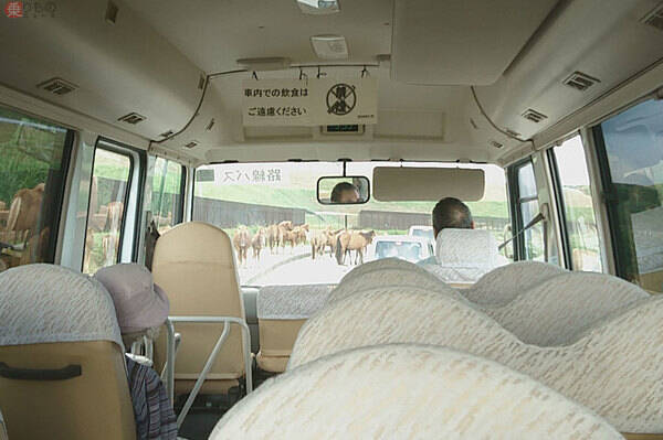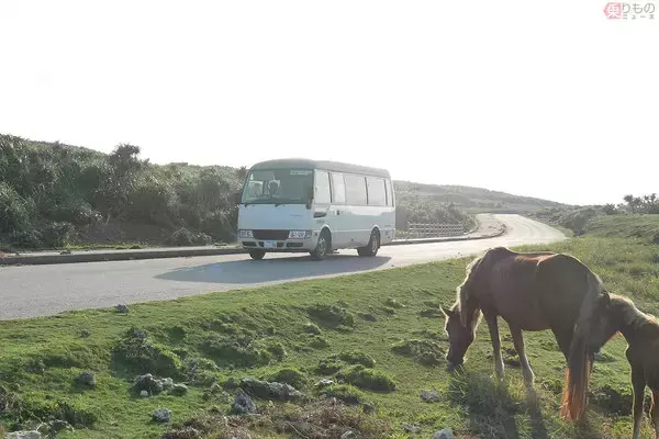 日本最西端の島、沖縄県の与那国島で運行されている路線バスは、牧場地帯で馬の道路通過をひたすら待つなど、車窓や車内にのんびりとした光景が広がります。もちろん、「日本最西端のバス停」にも停まります。