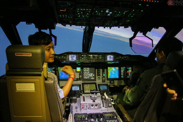 「プロフェッショナル・エアマンシップ・プログラム」にて、ASEAN各国のパイロットたちが国産輸送機C-2のシミュレーターで操縦を体験した(月刊PANZER編集部撮影)。