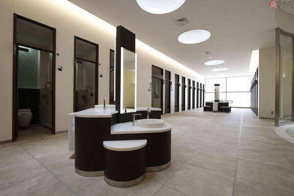 2019年7月に移転オープンした東北道 蓮田SA上り線のトイレ。個室に「トイレ忘れ物防止システム」が導入されている(2019年7月、恵 知仁撮影)。