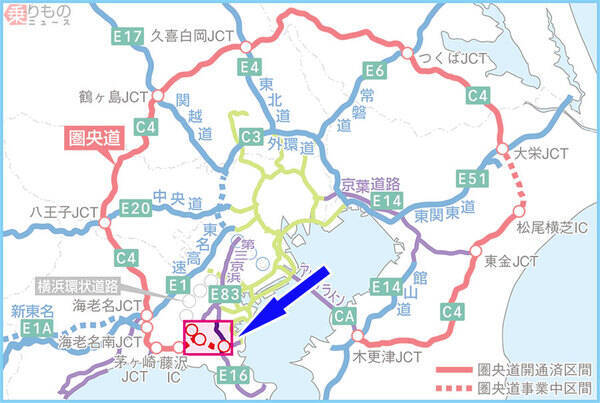 矢印の箇所が、圏央道の未開通区間である「横浜湘南道路」および「横浜環状南線」(画像:NEXCO東日本)。