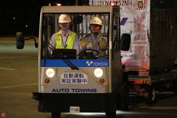 ANA(全日空)と豊田自動織機が2019年10月3日(木)、佐賀空港内の制限エリアで9月30日(月)から実施中の、貨物コンテナをけん引する「トーイングトラクター」の自動走行実証実験を、報道陣に公開しました。