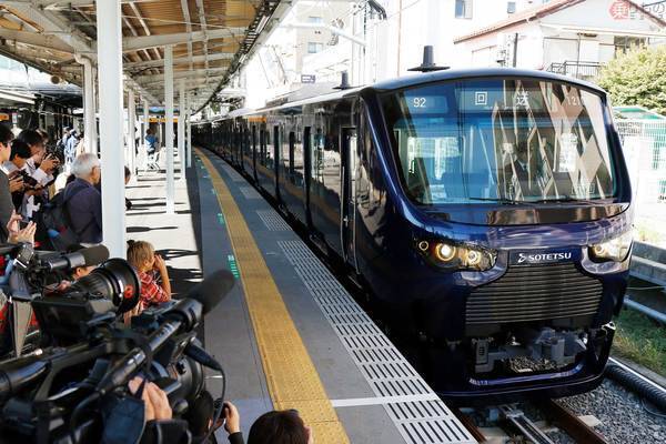 西谷駅に停車する相鉄・JR直通線の試乗列車。車両は、この直通線での利用を想定し、2019年に登場した相鉄12000系(2019年11月7日、恵 知仁撮影)。