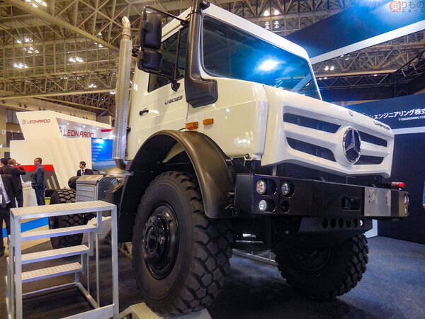 横浜市に本社を置くワイ・エンジニアリングは、2019年11月18日から20日まで幕張メッセ(千葉県)で開催された防衛総合イベント「DSEI JAPAN 2019」に、同社が輸入と販売を手がけている「ウニモグ」を出展しました。ドイツのダイムラー製で、一見トラックのような、トレーラーヘッドのような特殊車両です。