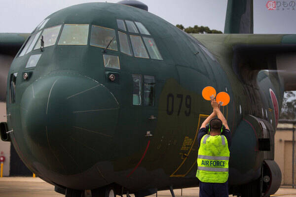 リッチモンド空軍基地に到着し、オーストラリア空軍のクルーの誘導を受ける航空自衛隊のC-130H(画像:オーストラリア国防省)。